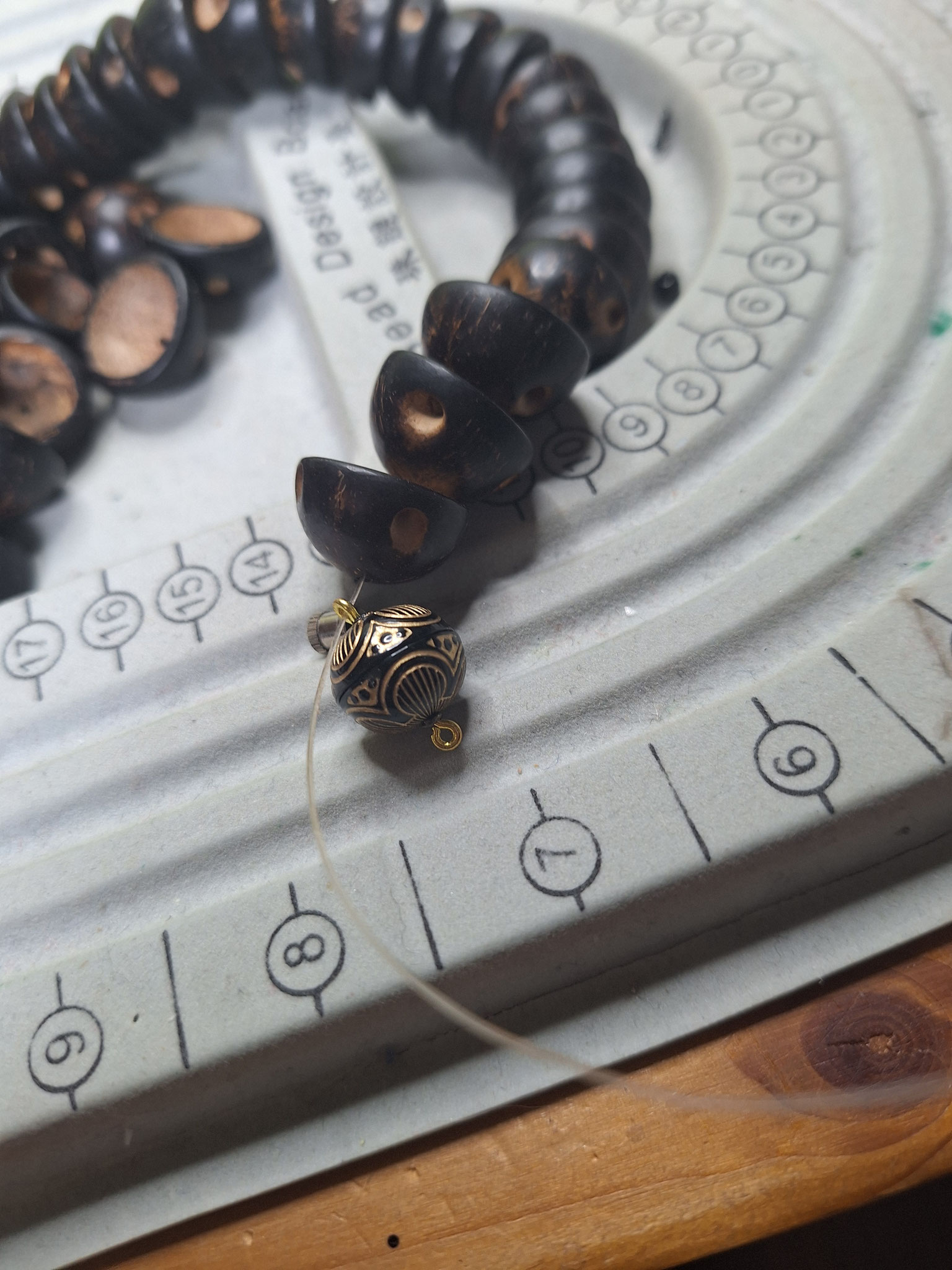 Vorerst kaufte ich diese runden Perlen dazu und knüpfte per Hand dieses Stück.
